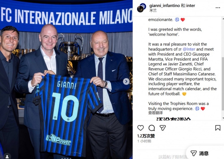 因凡蒂诺写道:我这次的经历可以用“回家”来形容。非常荣幸能访问国米总部,并与俱乐部CEO马洛塔、副主席兼国际足坛传奇萨内蒂、首席营收官乔治-里奇以及首席参谋马克西米里亚诺-卡塔内塞会面。我们讨论了许多重要议题,包括球员福祉、国际比赛日赛程以及足球的未来等等。参观俱乐部荣誉室是一次深受触动的经历!